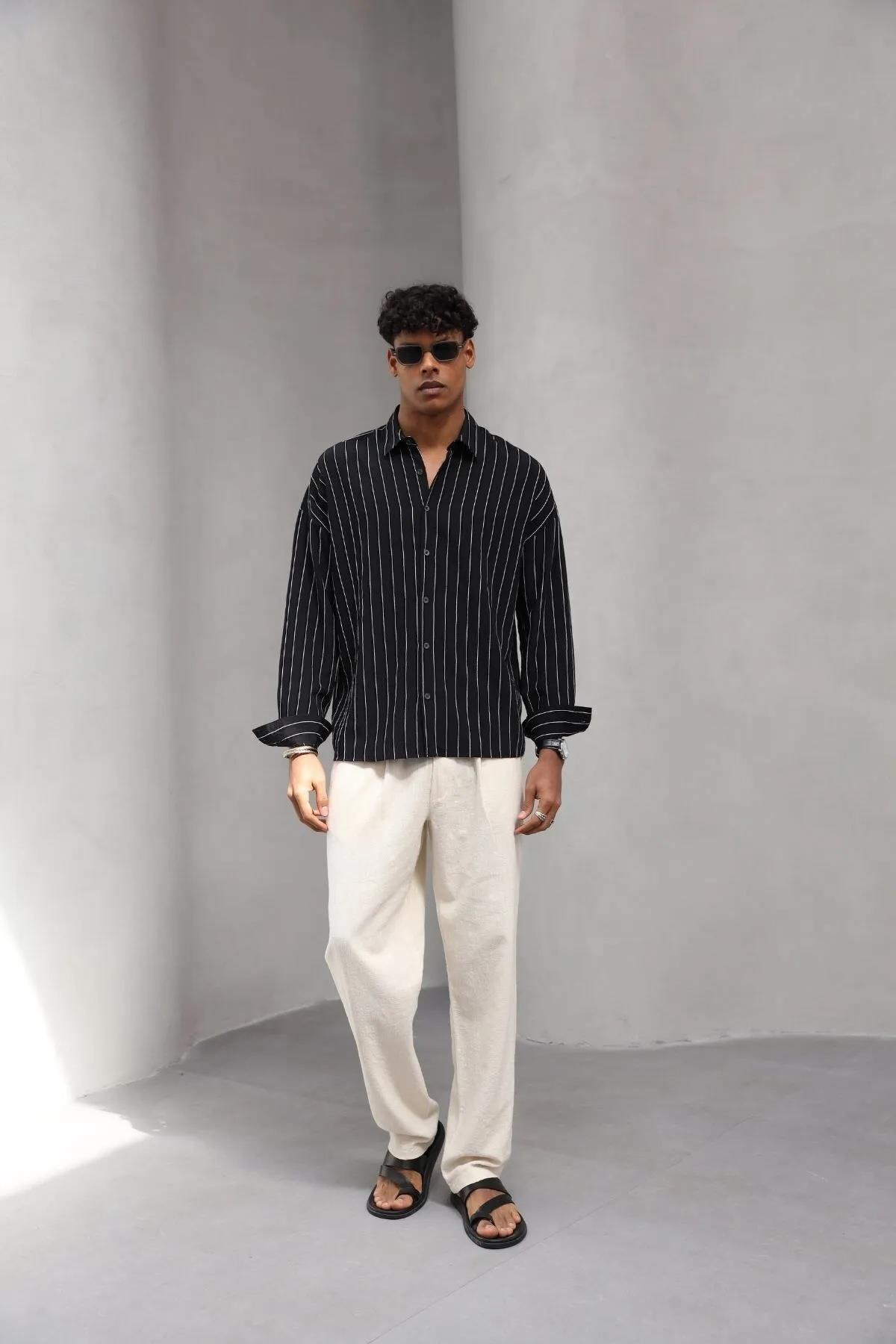 Erkek Premium Yumuşak Dokulu Çizgili Gömlek Siyah