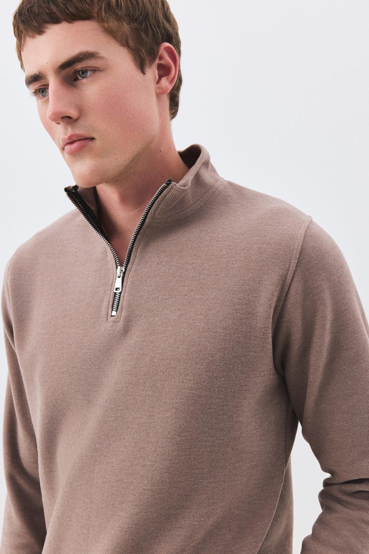 Erkek Standart Fit Pamuklu Selanik Kumaş Yarım Fermuarlı Dik Yaka Sweatshirt Camel