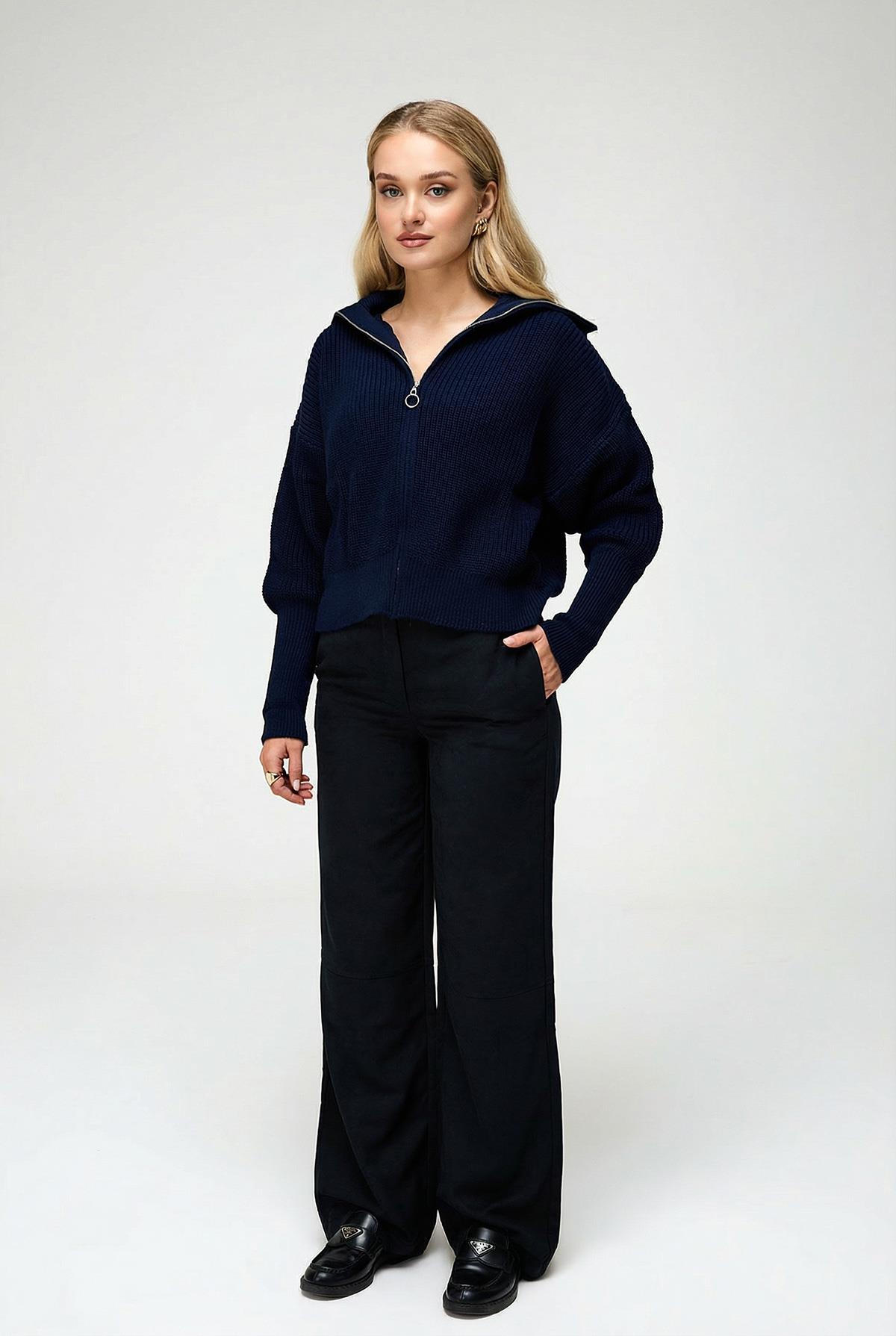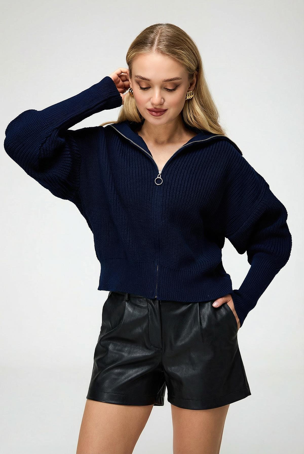 Kadın Fermuarlı Balıkçı Yaka Triko Hırka Lacivert 6919