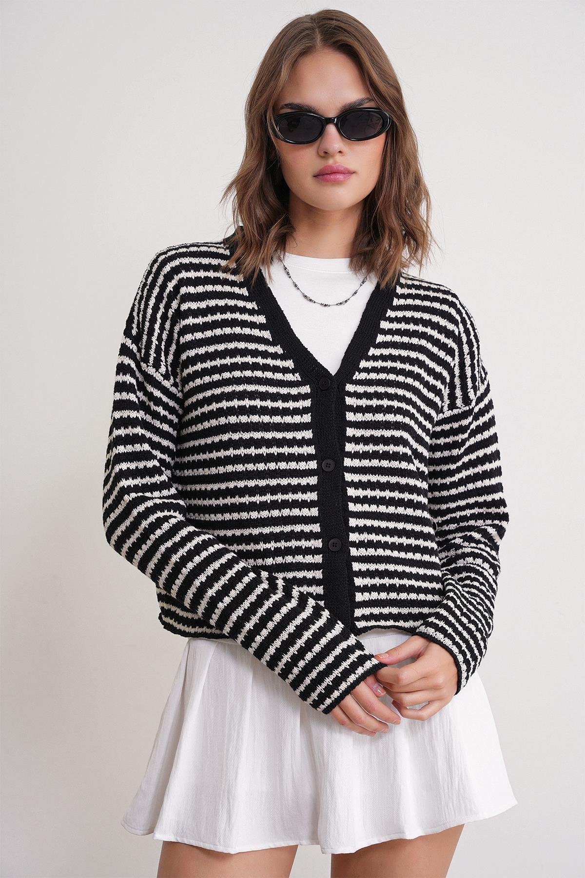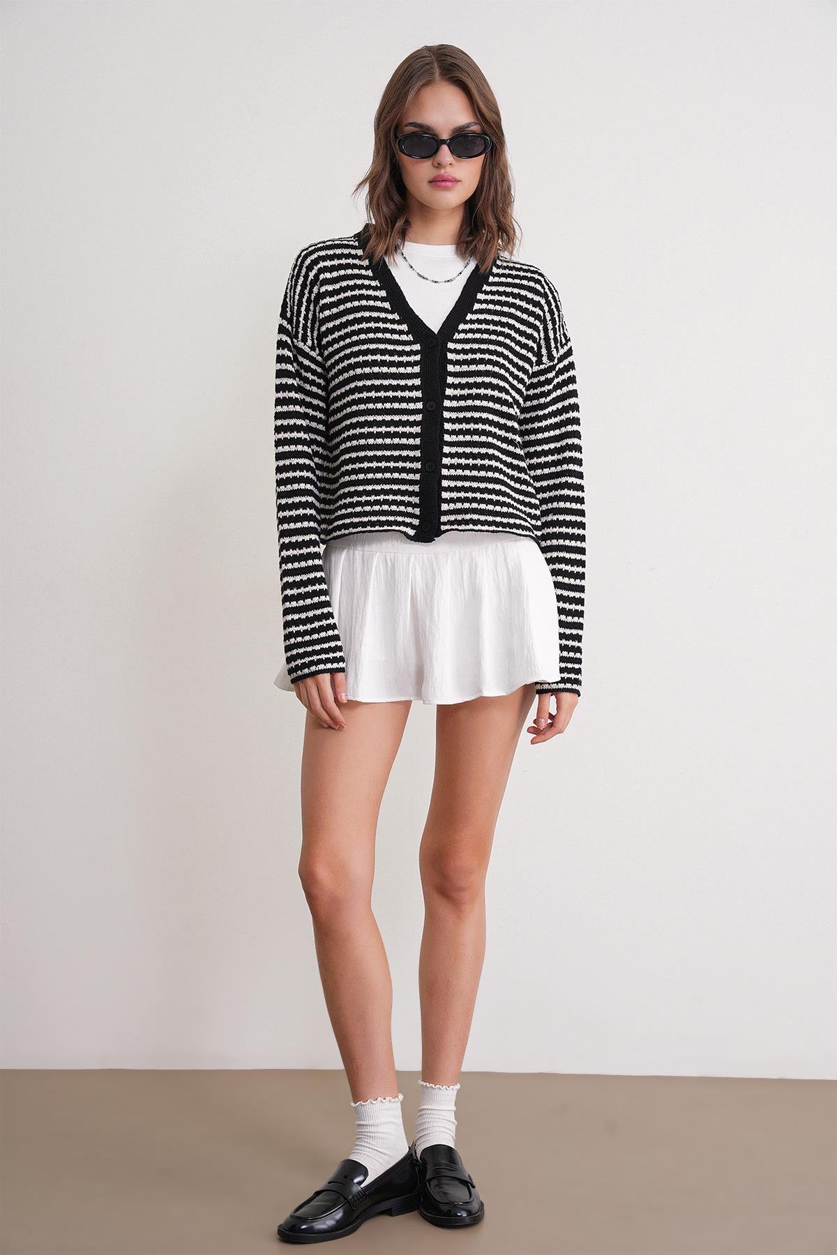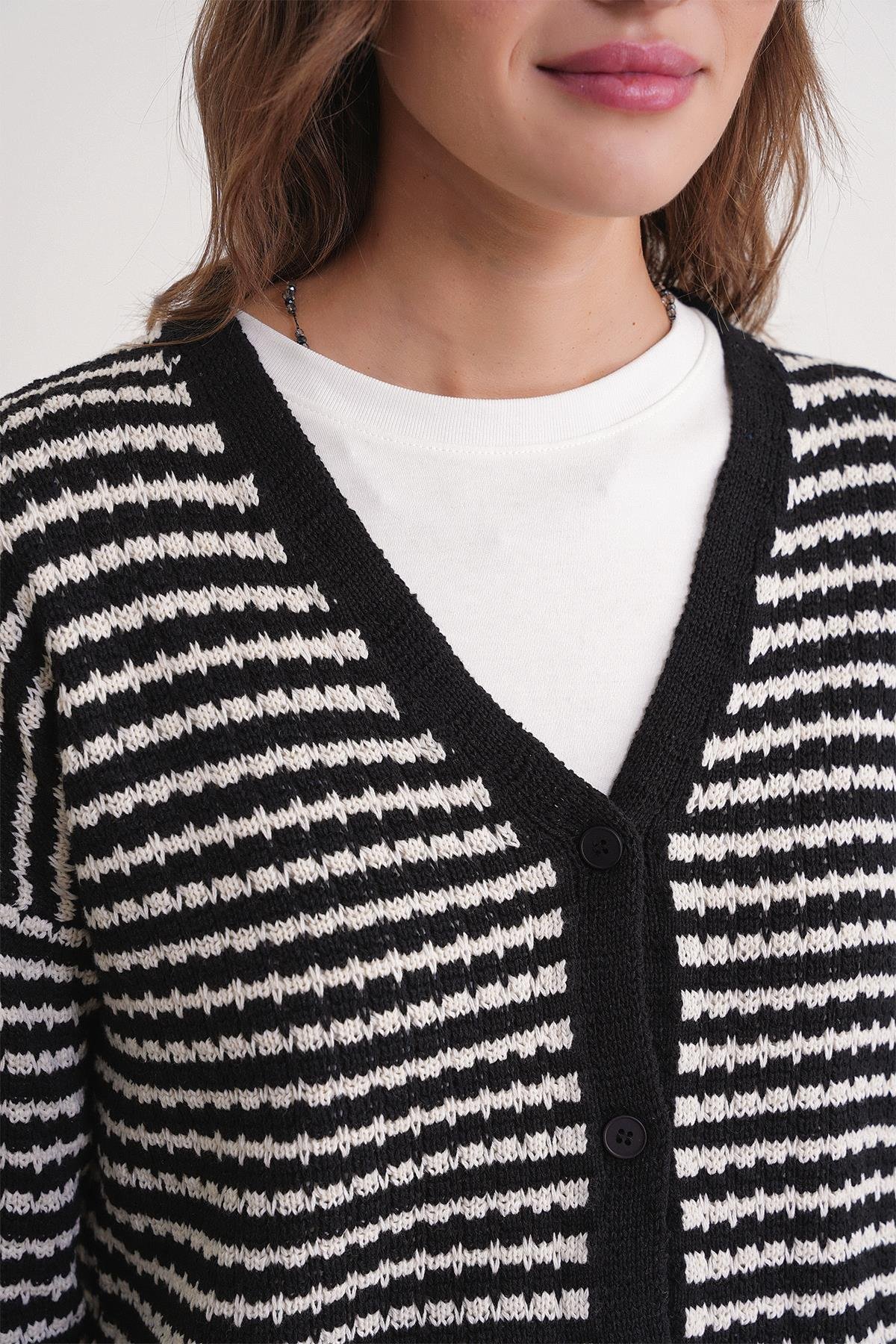 Kadın V Yaka İnce Çizgili Triko Hırka Siyah 6948