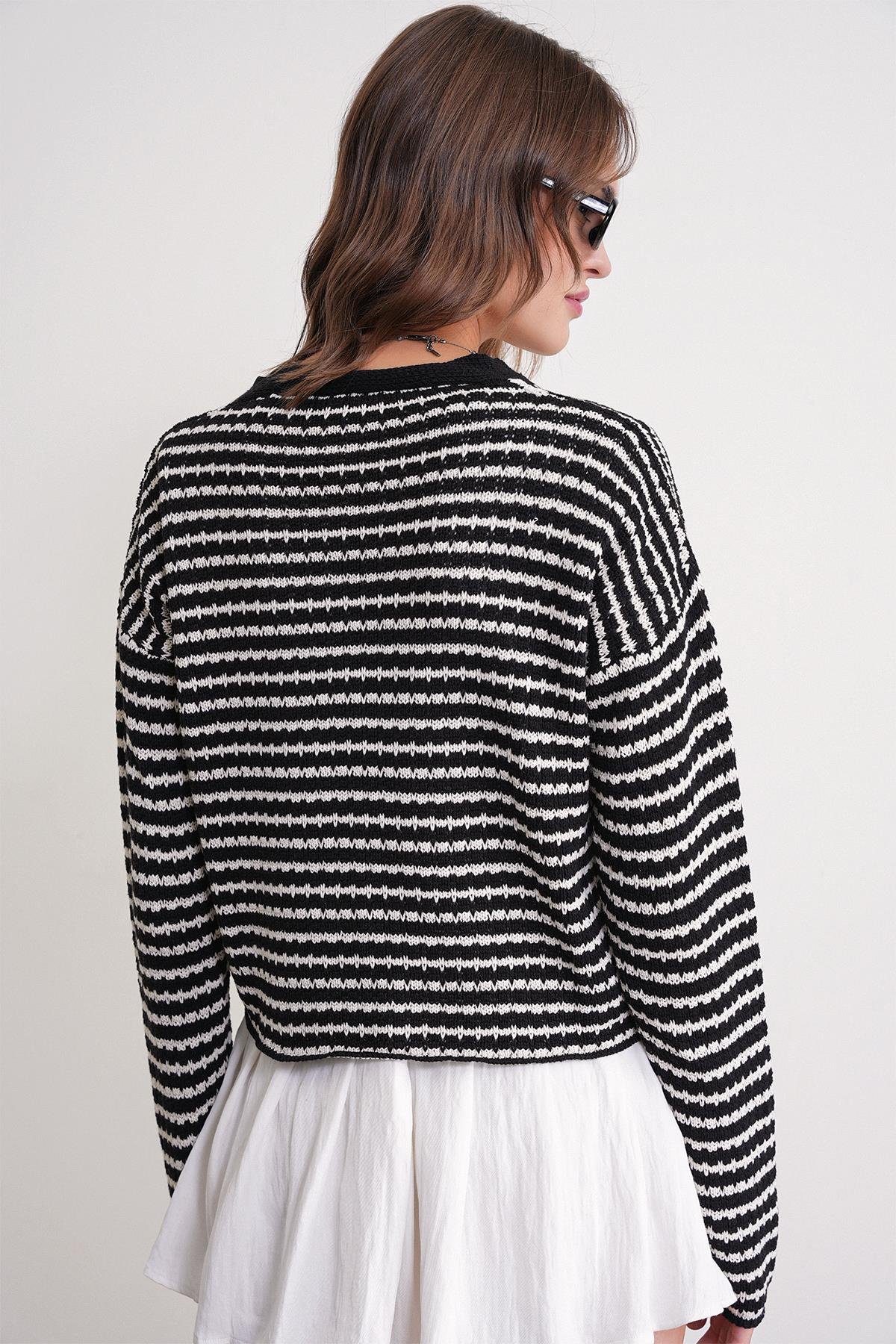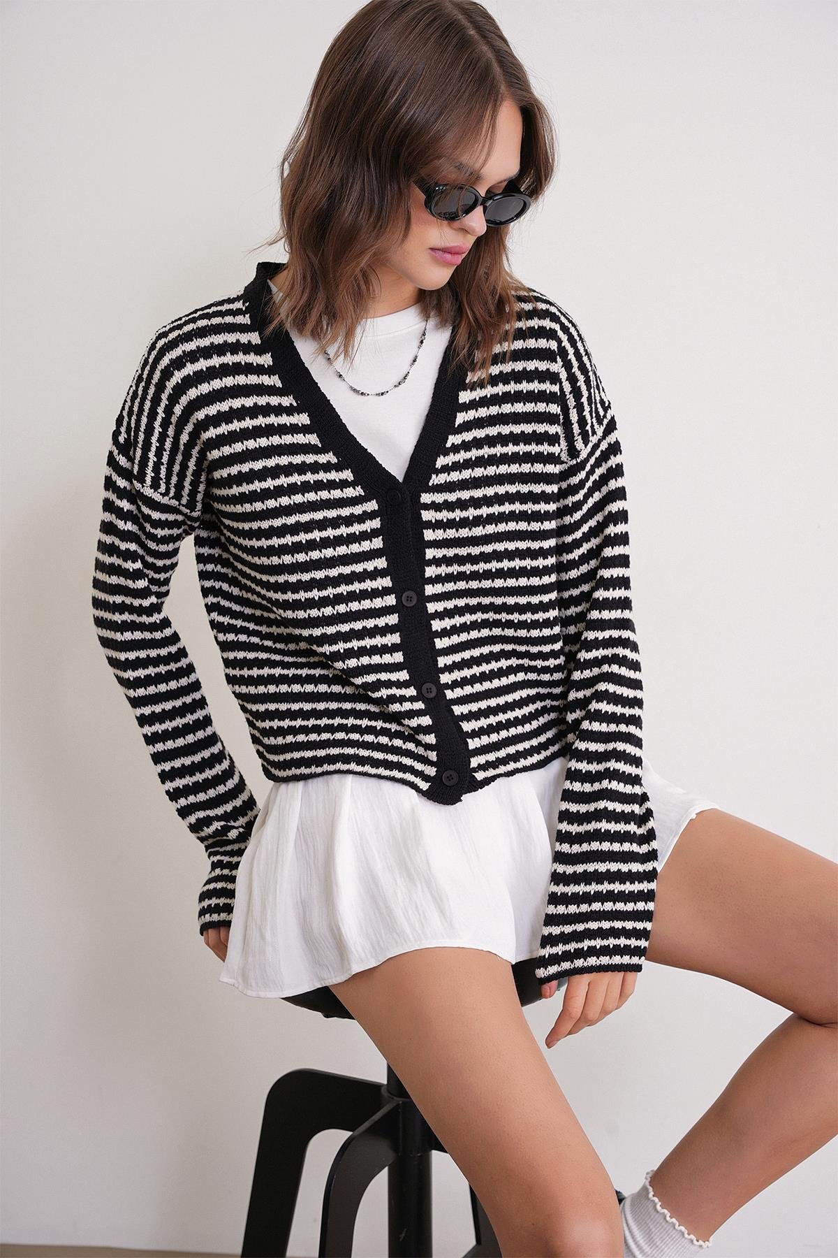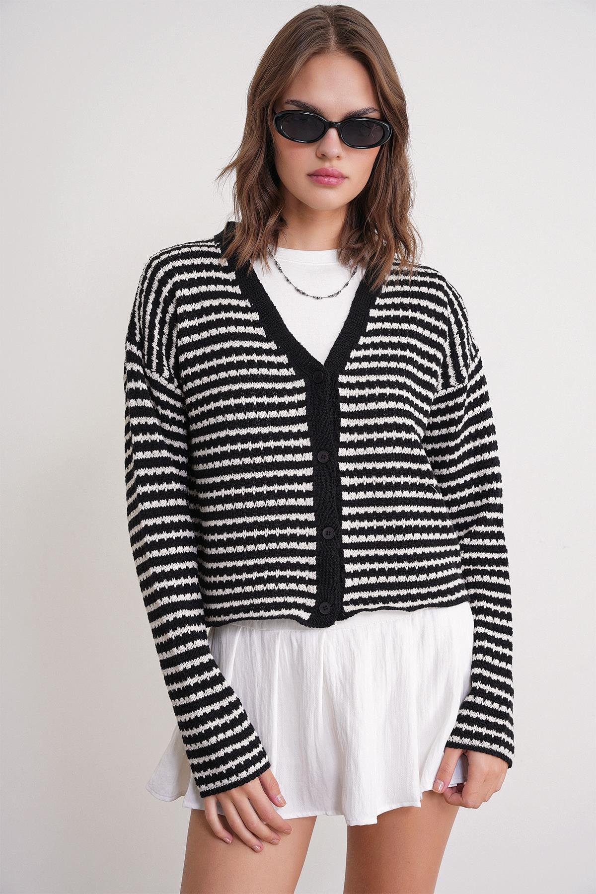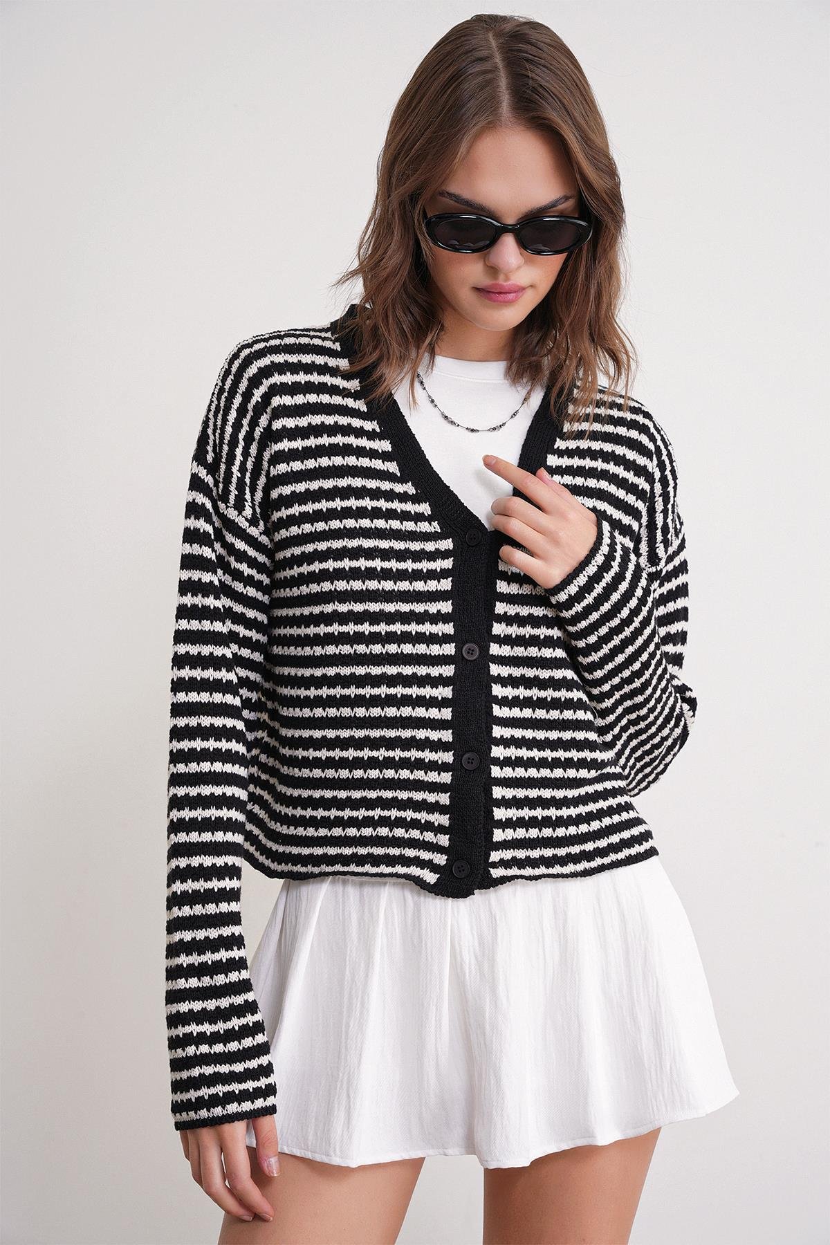 Kadın V Yaka İnce Çizgili Triko Hırka Siyah 6948